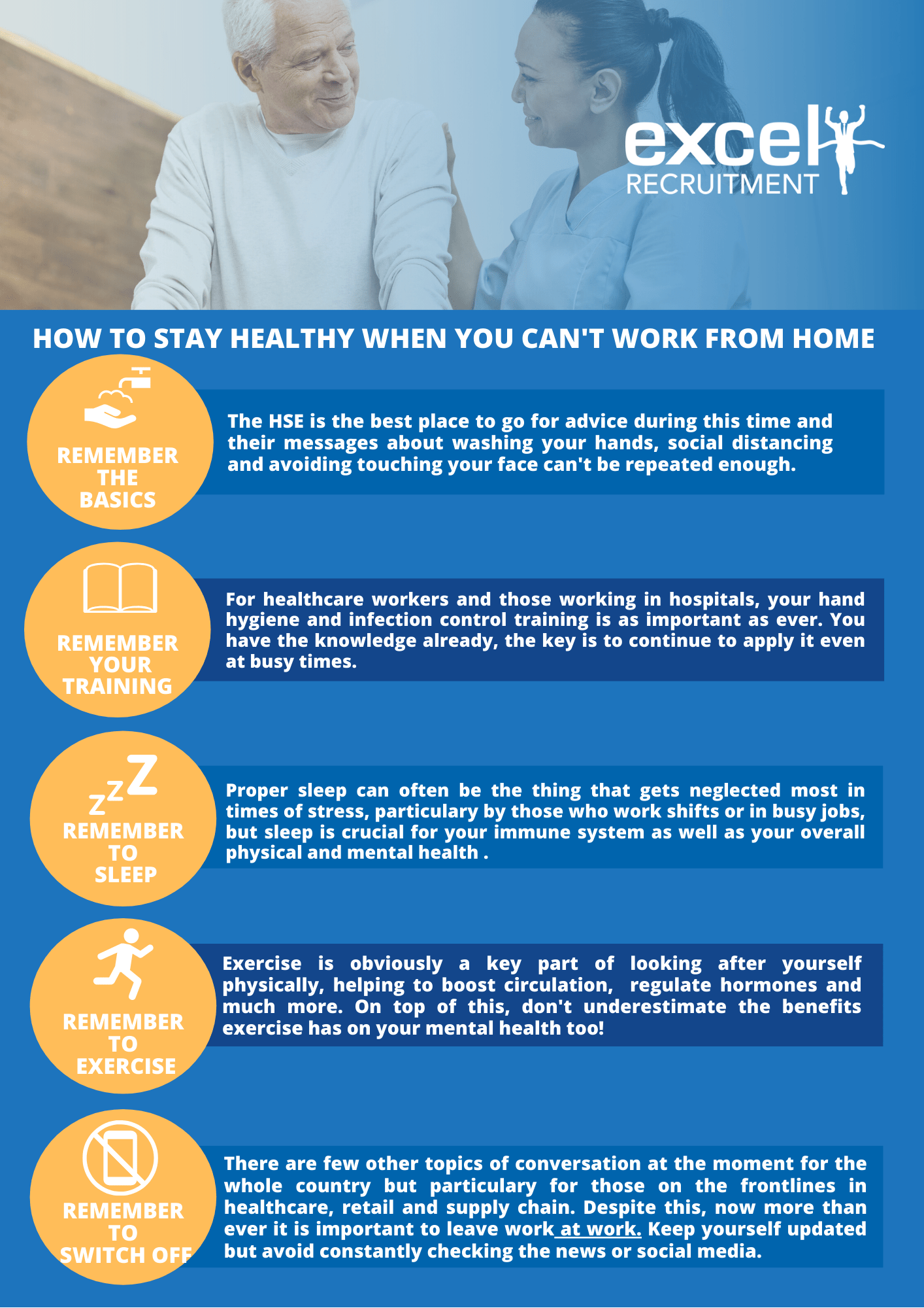 As all of us across the country continue to work against the spread of COVID-19, government instructions continue to be to stay home, stay healthy, and work from home if you can. At Excel Recruitment, we work directly with clients and candidates on the frontlines of this crisis dealing directly with the needs of the public. For all these fantastic workers (including our own temp team) in healthcare, retail, warehouses, supply chain and more, working from home isn’t an option. So for those on the frontlines right now: what can be done to mind both your physical health, mental health, and to stay healthy overall?